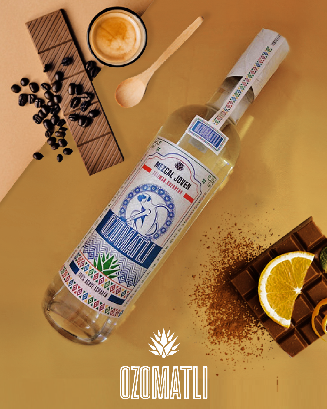 The label of ozomatli mezcal should feature vibrant tones, reminiscent of the agave plant from which it is made. The shapes on the label are inspired by the patterns found in traditional Aztec art, paying homage to the cultural heritage and craftsmanship. As for the technical aspects, the label includes relevant information such as the alcohol content, volume, batch number, and the distillery's name and location.